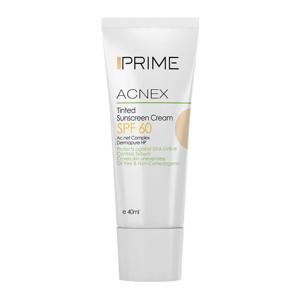 کرم ضد آفتاب رنگی فاقد چربی پرایم مدل Acnex با SPF60، با قابلیت کنترل ترشح سبوم باکتری های مولد آکنه را مهار می کند. ضد آفتاب فاقد چربی پریم خاصیت ضد آکنه دارد و مناسب پوست های چرب و آکنه دار می باشد. محافظت از پوست در برابر اشعه آفتاب اولین قدم برای مراقبت پوست می باشد. این کرم یک لایهی محافظتی در برابر اشعه UVA، UVB و IR روی پوست ایجاد میکند. این محصول فاقد هرگونه چربی است و کنترل کننده ترشح سبوم، ضد آکنه و ضد باکتریهای مولد آکنه نیز می باشد. کرم ضد آفتاب رنگی پریم با قردرت محافظتی 60 برای پوستهای چرب و آکنه دار بسیار مناسب است.