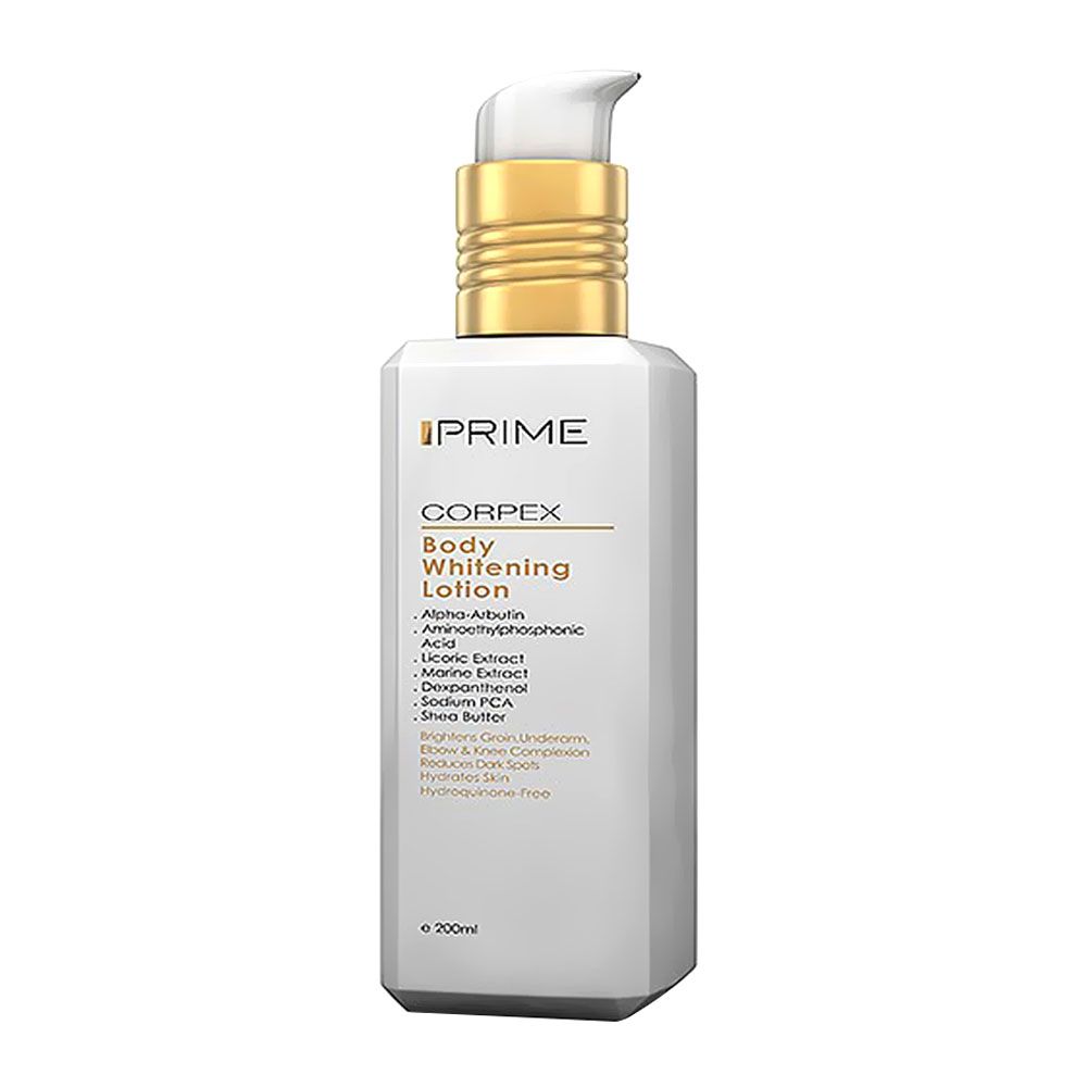 لوسیون روشن کننده بدن پریم مدل Corpex، تیرگی کشاله ران، زیر بغل، گردن، آرنج و زانو را رفع می کند این محصول برطرف کننده لک های تیره ناشی از بیماری های پوستی مانند اگزما یا هایپرپیگماتناسیون می باشد و روشن کننده لک های پوستی ناشی از بیماری کبدی، تابش اشعه UV، تغییرات هورمونی، بارداری، مشکلات ژنتیکی و .... می باشد. همچنین این محصول مرطوب کننده قوی پوست هم است.