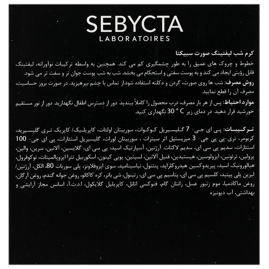 پلی پپتید لیزین/ آرژنین موجود در این کرم لیفتینگ با خنثی کردن تخریب پروتئین کلاژن و الاستین، به حفظ آن ها در بافت پوست کمک کرده و مانع از شل شدن و افتادگی پوست می شود. روغن های مغذی، دیگر ترکیبات موجود در در کرم لیفت سبیکتا شب هستند که با تامین رطوبت لازم برای پوست می توانند در به تعویق انداختن روند پیری پوست موثر واقع شوند.
